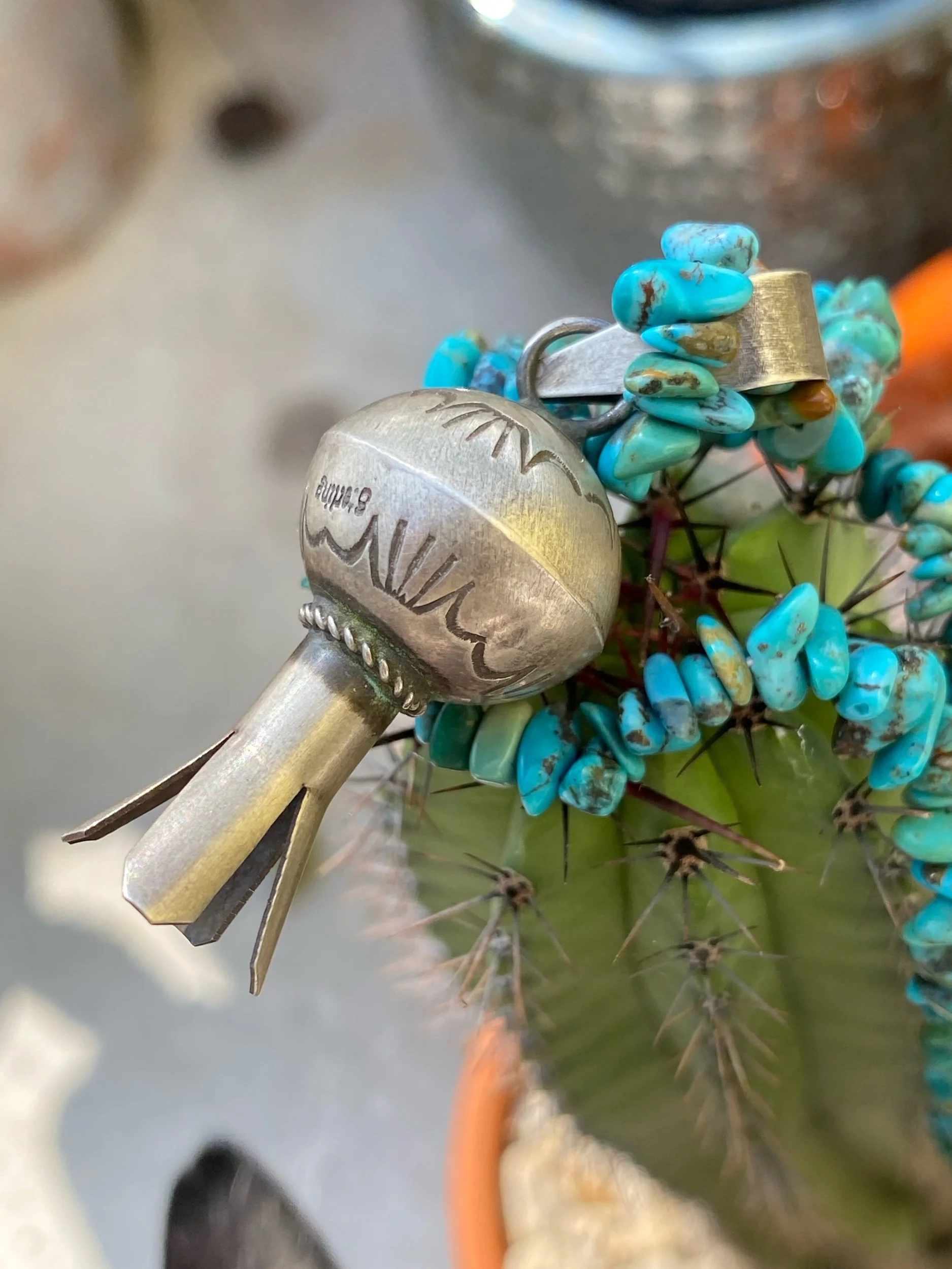 TUCK&WOLF › Sterling Squash blossom pendant by Mark TwoBears Rutledge on kingman strand with sterling cones Image 1 of 7 Image 2 of 7 Image 3 of 7 Image 4 of 7 Image 5 of 7 Image 6 of 7 Image 7 of 7 Sterling Squash blossom pendant by Mark TwoBears Rutledge on kingman strand with sterling cones $220.00 • 16” + 2” extensor chain Add To Cart Added! • 16” + 2” extensor chain